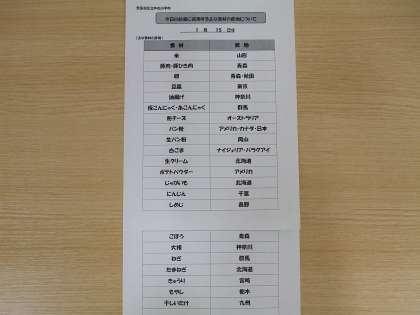 今日は群馬県の郷土料理給食です。キャベツやこんにゃくいもは日本一の生産量で有名ですが、他にも利根地区の「大豆・大豆製品」、下仁田の「長ねぎ」、「しいたけ」などが地場産物としてあります。いろいろな地域の郷土料理を、家庭でもぜひ作ってみましょう。