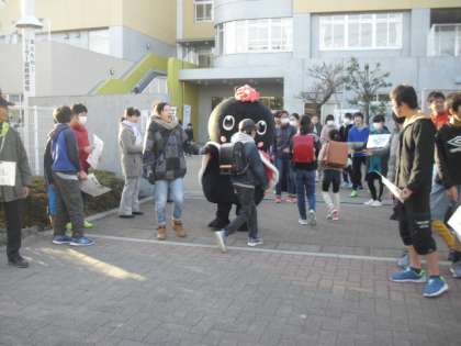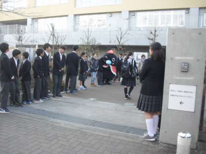 からぴょん、地域の方々とともに朝のあいさつキャンペーンを実施しています。隣の芦花中学生もからぴょんと一緒にご挨拶です・・・・
