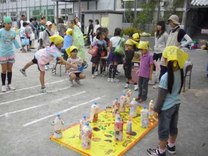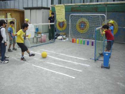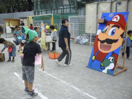 まとあてゲーム、キックターゲット、輪投げゲームと新BOPの子どもたちが準備したお店にはたくさんのお客さんの列ができました。お店の運営は前半と後半に分かれています。運営でない時間は、お店を回って楽しみます。