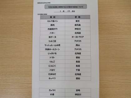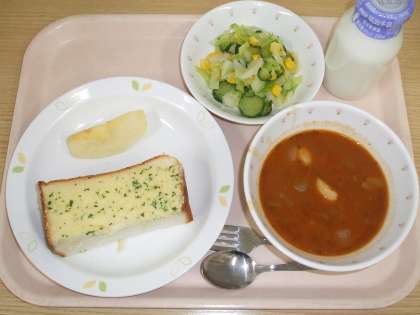 給食の「トマトシチュー」には、味付け用のトマトケチャップ、トマトピューレ以外に、生の真っ赤なトマトを角切りにして入れています。トマトのうま味が詰まった、体が温まる一品です。