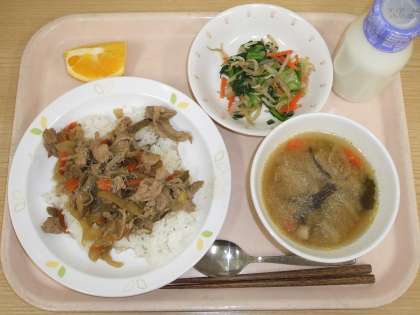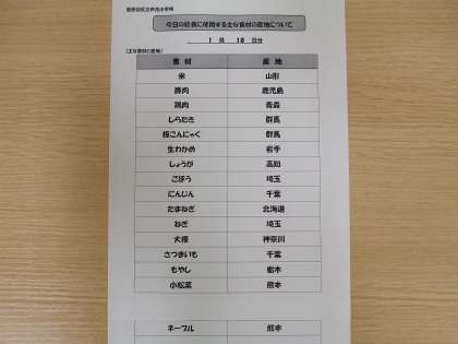 鹿児島県の郷土料理の1つ「さつま汁」。給食では一口大の鶏肉と、根菜をたくさん使って作りました。味付けは“みそ”ですが、九州地方でよく食べられている「麦みそ」を使うと、甘めの味に仕上がります。