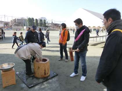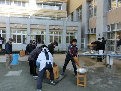 保護者、地域の皆様にまじって、先生たちも餅つきに精を出しています。誰ですか? 「私は食べる専門です」と言っている人は。でも、つきたてのお餅を味わうのが待ち遠しいですね。