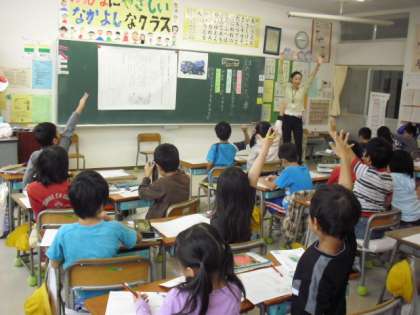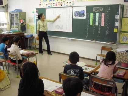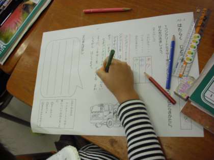 1年生の国語の授業の様子です。単元「はたらく じどう車」を学習しているところです。働く自動車について、使い道、つくり、はたらき方の観点から働く自動車について理解し、興味・関心を高めていきます。観点毎に色分けをしてサイドラインを引きながら読み進めます。この時間は、コンクリートミキサー車について学習しました。次の時間はどんな車かな。