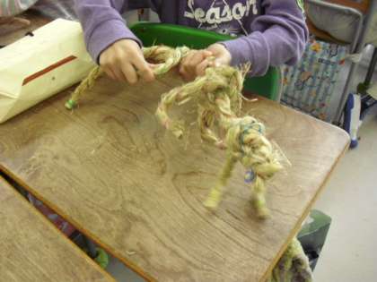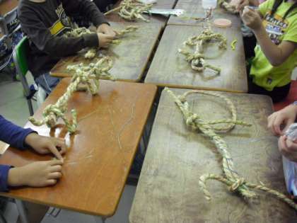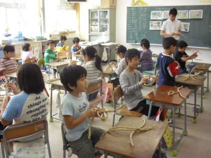 2年生の図工の授業の様子です。立体作品「なわのへんしん」の制作に取りかかったところです。まずは、荒縄をいろいろな形にしながら作品へのイメージを膨らませます。子どもたちは縄の感触を楽しみながら取り組んでいます。どんな作品に仕上がるのか楽しみです。