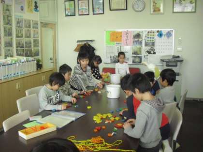 座ってできる遊びとして、誘った形づくりに参加している子どもたち・・・