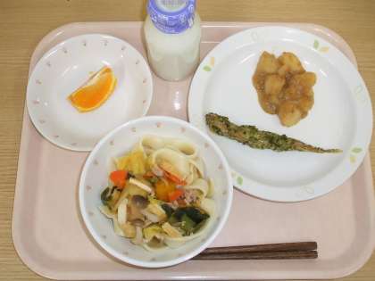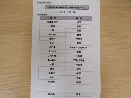 今日は山梨県の郷土料理給食です。代表的な料理の1つ「ほうとう」。給食では“冷凍ほうとう”を使い、モチモチした食感を楽しみました。