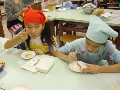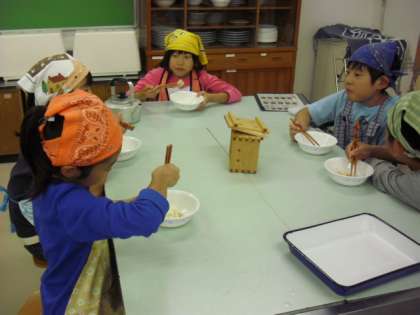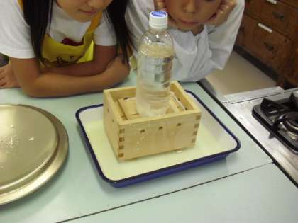 「早くお豆腐ができないかな〜」重石がわりのペットボトルのじっと見つめながら待つ子どもたち。出来上がりました!自分たちで作った豆腐の味は格別です。どの子も満足そうな表情です。子どもたちの学習はこれからいよいよ大豆をテーマにした個別課題の学習に移っていきます。