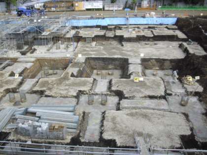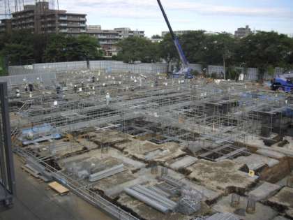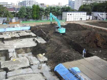 新校舎の建設工事の様子です。基礎工事がテニスコートの裏から東側に広がってきました。再度、土を掘り起こしながらコンクリートで固め、土台となる部分の工事の最中です。打ち込んだ杭の先端の部分も確認できます。
