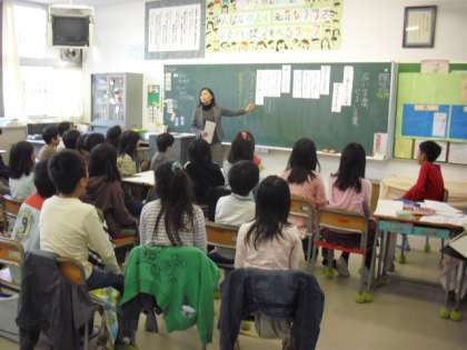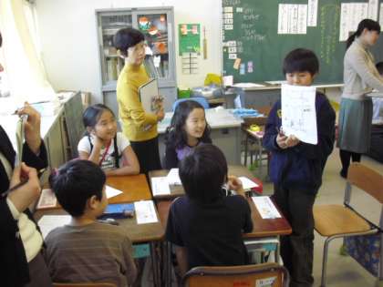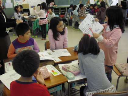 3年生の国語の研究授業の様子です。単元「広い言葉、せまい言葉」の学習で、自分が紹介したい内容の発表会を行いました。発表会なので、「話し方」と「聞き方」に学習の重点をおきました。子どもたちには、自分の伝えたいことを分かりやすく伝えるためには、どのように話せばよいか、どのように聞けば相手の伝えたいことが理解できるかという視点を与え、全員で確認し、発表です。子どもたちは発表のために準備した資料を活用しながら、調べたテーマについて発表し合いました。発表に対しては、よかったところや工夫したところなど互いの感想も伝え合いました。本校は授業の中で「ことばの力」を重視する学習活動を意図的に取り入れています。