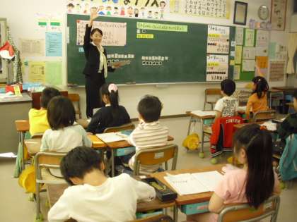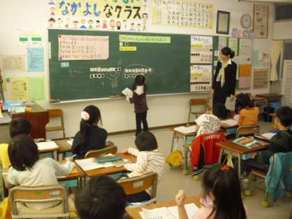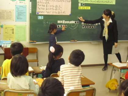 1年生の算数の研究授業の様子です。単元「たしざん(2)」で、繰り上がりのあるたしざんの学習を行いました。数の合成分解で10の束をどのようにつくるのかを学びます。この学習で何を学ぶのかをしっかりと子どもたちに伝え、一人一人が十分に考えることができるようにノートに図を描きながら学習を進めました。自分の考え方を黒板に書いて発表します。ことばで伝えることで理解が確かなものになります。授業ではたくさんの手が挙がりました。授業展開の中で「ことばの力」を重視した学習活動を効果的に取り入れました。