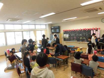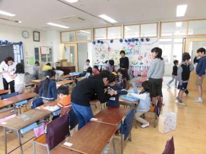 6年生は当番を決めて、毎朝1年生のお世話をしています。まずは、昇降口で1年生を迎えます。「おはよう。」とあいさつもすすんでしています。その後、教室で名札を付けてあげたり、ランドセルのしまい方を教えてあげたりしています。とても頼りになる存在です。写真は、10日(火)の様子です。