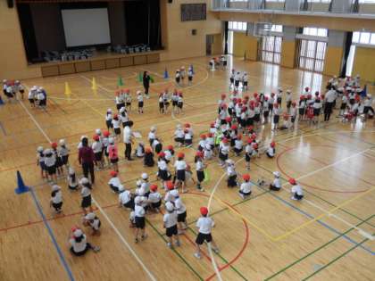 2年生は14日(土)、5クラス合同の体育を行いました。4人一組になって新聞紙に乗せたボール運びをしました。4人の協力が大きなポイントです。人数の多い男子チームに合わせて、リレーの順番を決めました。多くのグループがボールを落とすことなく運ぶことができました。