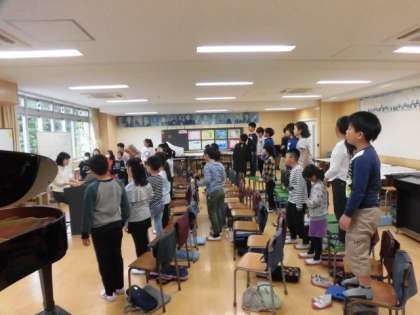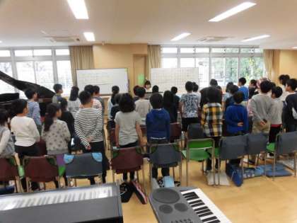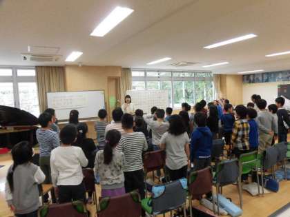 17日(火)、4年生は第一音楽室で音楽の学習をしていました。音楽の先生とともに「ゆでたまご」をイメージした発声をこころがけ歌の練習をしました。口をしっかり開けて美しい声を出そうとする姿がありました。