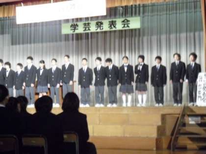 芦花中学校の学芸発表会の様子です。これまでに取り組んできた学習の成果を様々な形で発表します。準備を進めてきた実行委員会の挨拶に続き、発表会は幕を開けました。