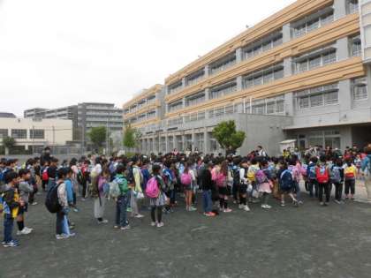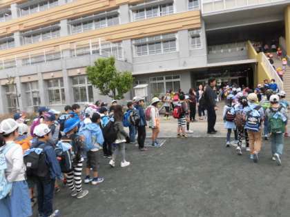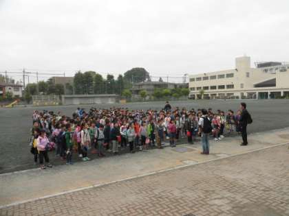 19日(木)の朝、校庭に元気いっぱいの3年生が集合しました。多摩動物公園に遠足に行くためです。ロカラスマーク入りのバンダナをリュックサックに結びつけ、健康観察を行いました。出発式のあと、午前8時過ぎに学校を出発しました。