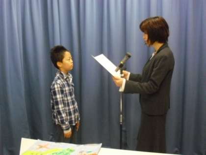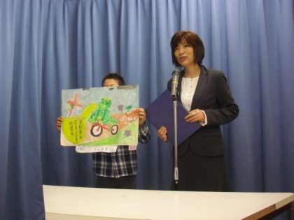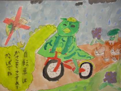 テレビ放送で行った全校朝会の様子です。平成22年度秋の全国交通安全運動交通安全児童画展において佳作に選ばれた児童の表彰をしました。雨の自転車に乗る時は傘をさすと危険なのでカッパを着るようにというメッセージをこめた作品です。河童を描いたことやカッパにキュウリの模様を入れた工夫について説明してくれました。