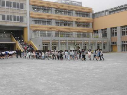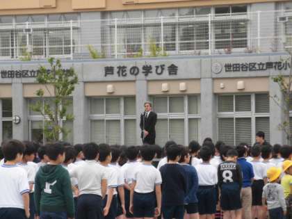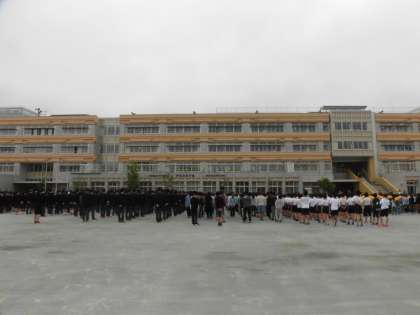 23日(月)は、小学生と中学生が校庭に並び「合同朝会」をしました。今回は、中学校の校長先生からお話がありました。「あいさつ」「みだしなみ」「ことばづかい」など小学生にとっても中学生にとっても心がける大切な内容でした。朝会後は、学年ごとに行進をして教室にもどりました。
