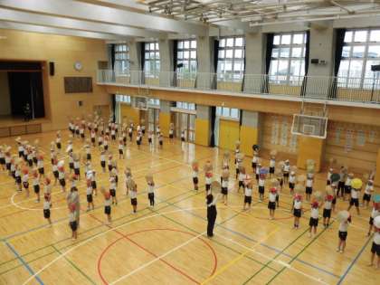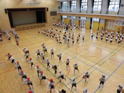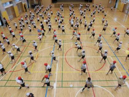 8日(火)、3年生は5時間目に体育館で「花笠音頭」の練習をしました。子どもたちは、各自で用意した段ボール等で作った花笠を持っていました。前半は全員同じ向きに踊りますが、後半は移動があります。笠の向きに気を付けながら練習を重ねていました。