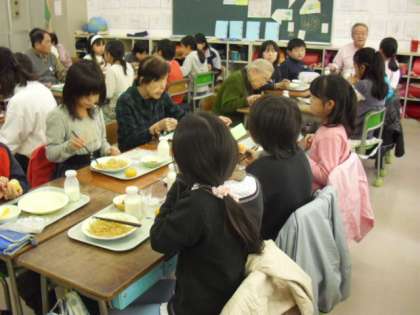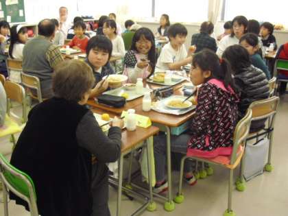 4年1組で行った芦花ホームの方々とのふれあい給食の様子です。子どもたちとの会話もはずみました。食べ物の好みの話、昔やっていた遊びの話、なかには、出身地のくらしの様子などを話してくれた方もいたそうです。