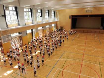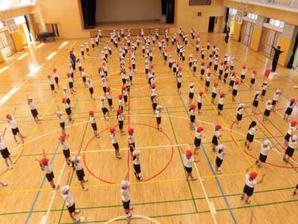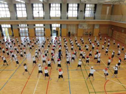 11日(金)の1時間目、2年生は体育館で団体演技(表現)の練習を行いました。本番では両手に旗を持ちますが、旗なしで練習をしました。入場から退場までの中で3曲の音楽が流れます。子どもたちは、音を聞きながら右に左に腕をピンと伸ばしていました。