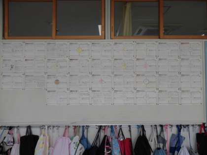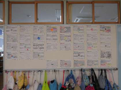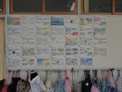 5年生は運動会のめあてを4こう目に分けてたてています。徒競走、ろかソーラン、き馬戦、係活動の4つです。中央の円には、ろかソーランで着るはっぴの背中に書く一文字を表わしました。高学年としての力強い思いが感じられます。