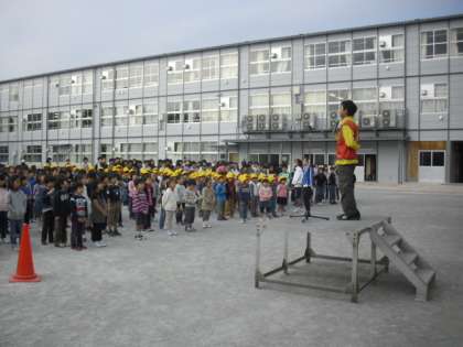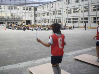 全校朝会の中で運動委員会の子どもたちが「なわとび月間」についてお知らせをした様子です。今日から30日まで、芦花小学校は「なわとび月間」として、なわとび運動を奨励します。運動委員会から、なわとびカードの使い方や、なわとび練習用の練習台の使い方の紹介がありました。1年生から6年生まで、なわとび名人を目指してがんばります。