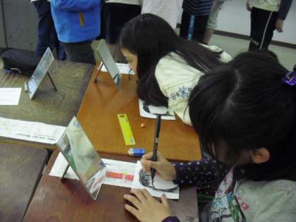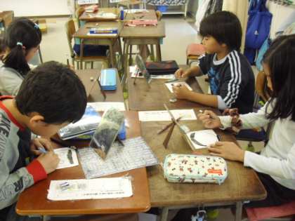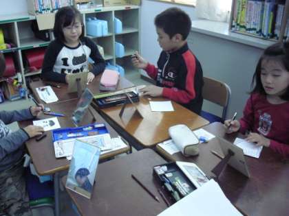 3年生が全校作品「自画像−全員集合」を制作している様子です。この作品は全校児童、職員で取り組んでいます。鏡を見ながら自分の顔を描くことは容易なことではありませんが、子どもたちは何度も鏡を見ながら、12cm四方の画用紙にペンで描いています。自分自身を見つめることを通して、自分を大切にする心も育てるよい機会となっています。