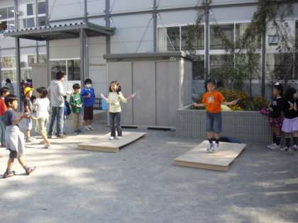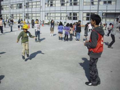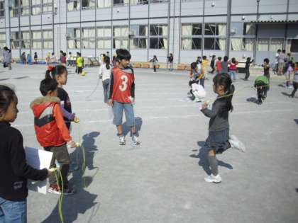 休み時間の様子です。なわとび月間ということで、早速子どもたちは「なわとびカード」を手に校庭で運動に励んでいます。ゼッケンを身に付けた運動委員会の子どもたちが検定に立ち合います。低学年の子どもたちのチャレンジを見守る高学年。「できたね。合格だよ。」と、なわとびカードに合格の印を付けてあげていました。微笑ましい光景です。なわとび練習台も好評で、列ができるほどです。なわとびを通して、運動に親しむとともに子どもたち同士のかかわり合いも広がります。