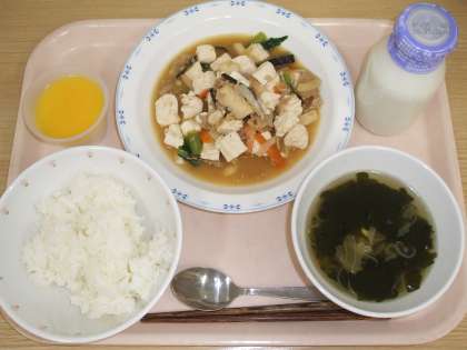 五目炒めの“五目”とは、“たくさんの”という意味があります。今日の「豆腐の五目炒め」には、豆腐のほかにも、豚肉、エビ、イカ、にんじん、たけのこ、しいたけ、ねぎ、小松菜を使いました。いろいろな食材のうま味を感じられる一品でしたね。