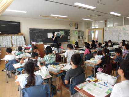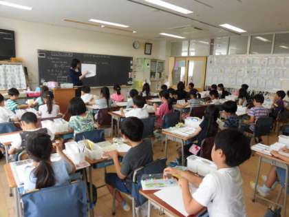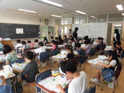 29日(火)の4時間目、3年1組は図画工作の授業でした。「みどりのつみ木」と題して、絵の具を使いました。青色と黄色を混ぜると緑色になることは子どもたちもよく知っていますが、そこに、青、黄、白、黒の絵の具を少しずつ混ぜ合わせて色を変化させていきました。画用紙に作った色で1個の積み木を描いていきました。色の変化を楽しみながら積み木を重ねていました。終了の合図を聞いた子どもたちは「もっとやりたーい」と次々に言っていました。
