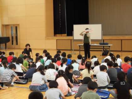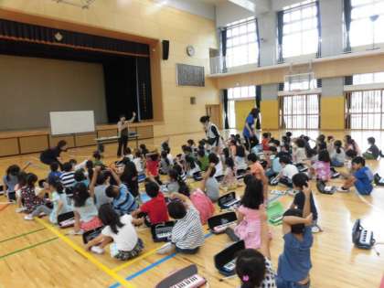 30日(火)の1・2時間目、1年生はけんばんハーモニカの講習会に参加しました。外部から講師をお招きしました。ドの音に親指を置くこと、シュークリームを包むように指先を丸めることなど順に進みました。子どもたちはうた口を初めてつけて、ドの音を時に大きく時に小さく出しました。最後は、講師の先生の演奏に合わせながらトゥトゥとタンギングをしました。写真は、1組3組4組の様子です。2組と5組は2時間目に第2音楽室で行いました。