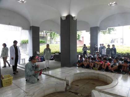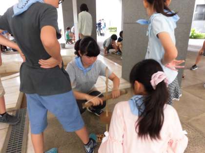 東京都埋蔵文化財センターでの体験の、もう一つの目玉は「火起こし」です。舞錐(まいぎり)という道具を使い、摩擦で火種を作り、移し火をしてそこに息で風を送り、木片から炎が上がれば成功です。やり方を教わっても、恐る恐る取り組む子どもたちが多い中、思い切って舞錐に力を込めたグループから待望の炎が上がると自然に拍手が起こり、それからは至るところで歓声が上がりました。