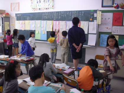 上の写真から、1年生の国語の授業の様子です。仲間分けをして黒板に貼る作業で、名前の記入を確認したり、貼る際の補助をしたりしているところです。