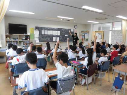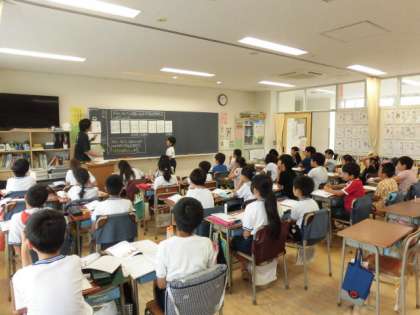 5月31日(木)の3時間目、4年3組と4組は少人数算数の授業でした。3組では単元「いろいろな四角形」の中の「平行四辺形」についての学習でした。前の時間に台形を学習した子どもたちは、例示された図形の中に「向かい合った2組の辺が平行の四角形」があることにすぐに気付きました。自分の考えをすすんで発表する姿がたくさんありました。