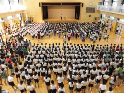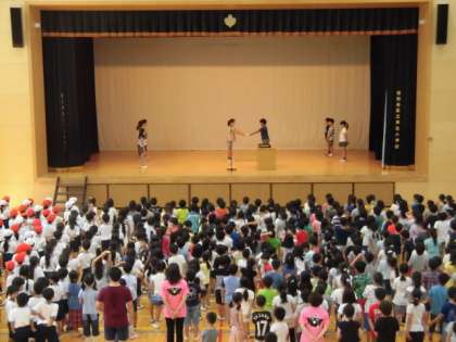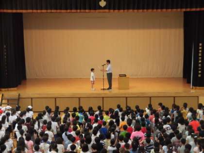 4日(月)の朝は、体育館で全校朝会を行いました。校長先生のお話のあとに、表彰をしました。さらに、あいさつキャンペーンの引きつぎがあり、4年生から3年生にバトンタッチされました。生活指導の先生からはトイレの使い方や朝遊びの約束についての話しがありました。
