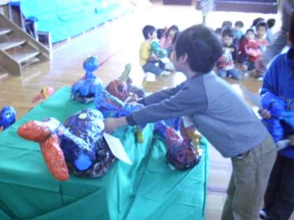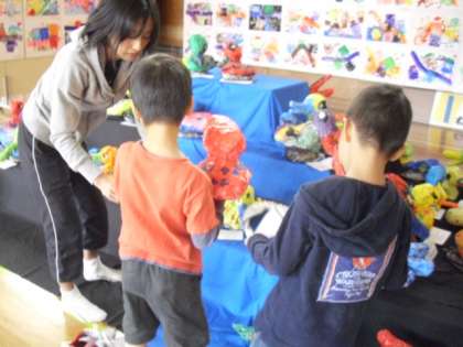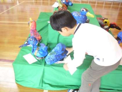 1年生が立体作品「おしゃれなとり」を体育館に運び展示をしているところです。作品を大事に大事に抱え込むようにして運んでいました。作品を展示台にそうっと置く様子から、作品への思いが伝わってきます。