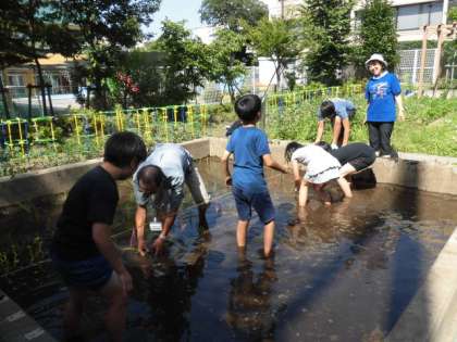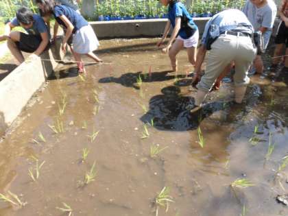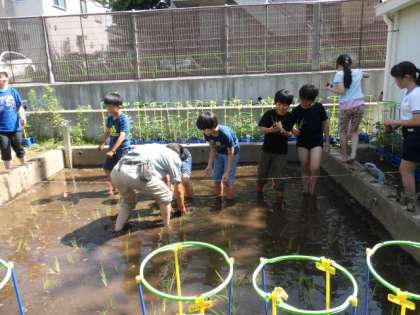 7日(木)、5年生は田植えに挑戦しました。午前中に3・4組が、午後に1・2組が行いました。はだしで田んぼの中に入った子どもたちは「ぬるぬるする」「歩きにくい」と言いながらも自分たちが育ててきたイネのなえを植えていきました。これから水の管理やイネの管理が始まります。写真は1組の様子です。