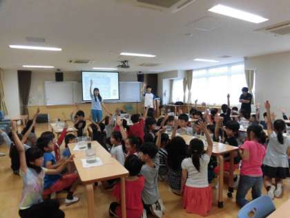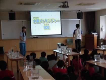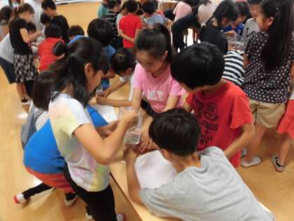11日(月)、4年生は社会科の学習の一環として「水道キャラバン」の皆さんにお越しいただきました。東京の水道水がどのように作られているのかを実験を交えて学習しました。子どもたちは、最後に試験を受けて見事水道メッセンジャー3級の資格を取りました。写真は、1組2組の様子です。