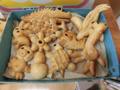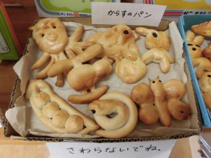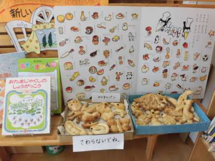 図書室に入ると目の前に手作りのパンが並べられています。「からすのパンやさん」のお話に登場するパンばかりです。作ったのは、本校の先生です。来室した子どもたちは、「食べたいな」と言っていました。
