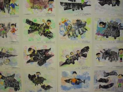 2年生の作品は、平面作品「どうぶつさん こんにちは」です。自分の好きな動物を紙を切ったり、ちぎったりして作った版画です。子どもたちの解説を読むのが楽しいです。