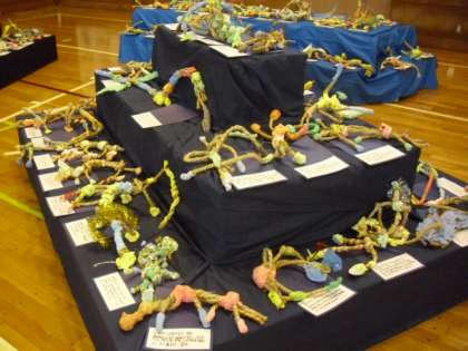 立体作品は「なわの変身」です。荒縄と針金を使い、いろいろな方向に曲げながら不思議な生き物を作りました。紙粘土の使い方や飾りが工夫されています。