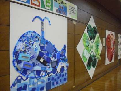 共同作品は「色☆色あつめて」です。クラスカラ—のものをいろいろ集めて作品にしました。近くで見ると、材料のおもしろさに驚きます。