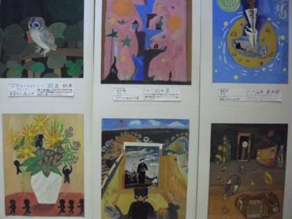 6年生の作品は、平面作品「芸術家の心にふれて」です。芸術家の作品から好きな絵や絵の部分を選び、自分の想像を加えて表現したものです。