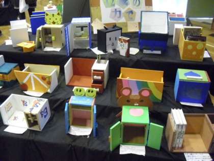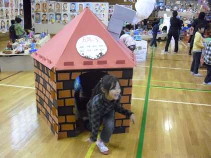 共同作品は「段ボールバンガロー」です。体育館の内外に展示してあります。もちろん中に入ることもできます。小さな子どもから高校生まで遊んでいました。
