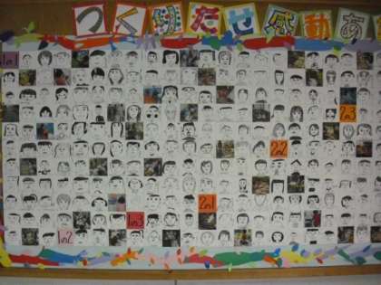 体育館出口の廊下掲示板には全校作品「自画像ー全員集合」があります。児童、そして教職員全員が自らの手で描いた自画像を並べた作品です。何人の教職員を見付けることができるでしょうか。