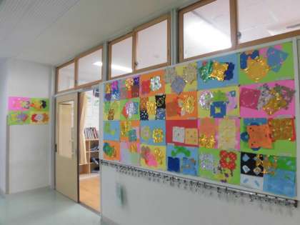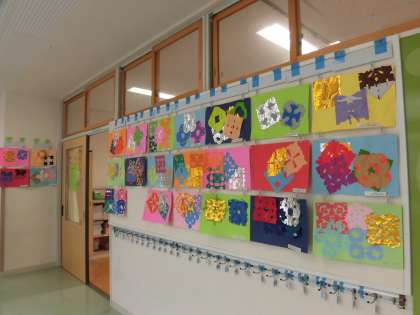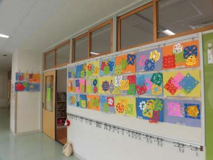 22日(金)、1年生のろう下に図画工作の時間につくった作品が掲示されました。作品名は「チョッキン パッで かざろう」です。色紙を折り、そこに切りこみを入れて開くと「わあきれい!」と子どもたちの瞳が輝きました。台紙選び、色紙のはり方などに子どもたちの個性が光っています。