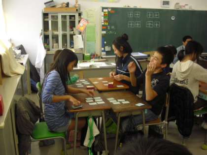 次は、6年生の日本語の授業です。百人一首を行っているところです。子どもたちの中に入って一緒に百人一首を楽しんでいるところです。
