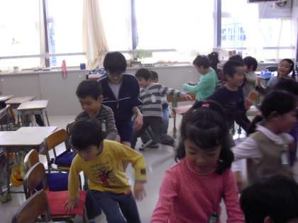 そして、1年生の学級活動の様子です。お楽しみ会を一緒に楽しんでいるところです。ちょうどフルーツバスケットを行っていました。