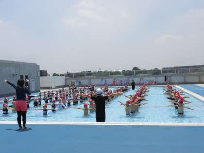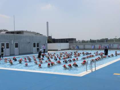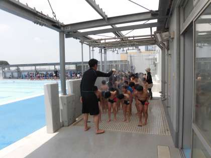 26日(火)の3・4時間目、1年生は水泳の授業でした。教室で水着に着がえてから、プールまで移動しました。準備運動、シャワーの順で進みました。シャワーでは、4人ずつ並んで水を浴びました。その後、プールの中に入りました。「肩までつかりましょう。」「あごまでつかりましょう。」ともぐる位置が深くなるたびに、子どもたちからは「エー」という歓声が挙がりました。