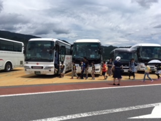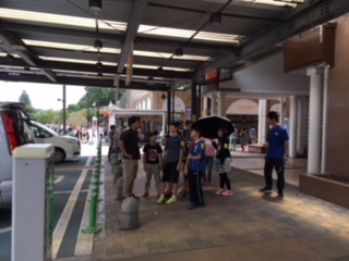談合坂サービスエリアで一休み。みんなでツバメの巣を見ています。